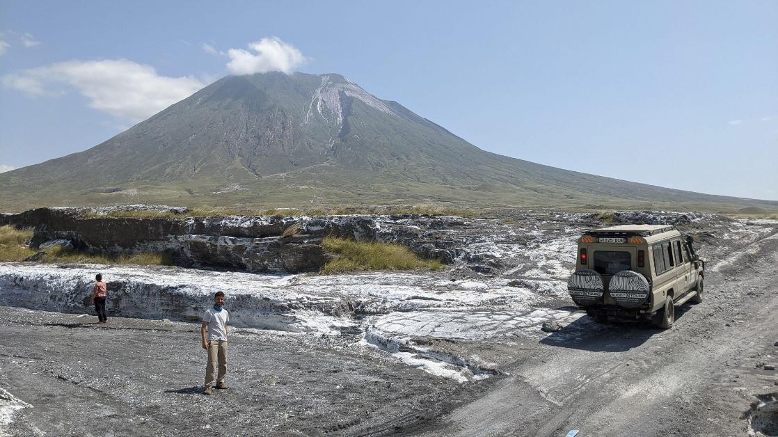 Stopping to examine the unique natrocarbonatite lava flows of Oldoinyo Lengai, in Ngorongoro Lengai UNESCO Geopark (Day 8)