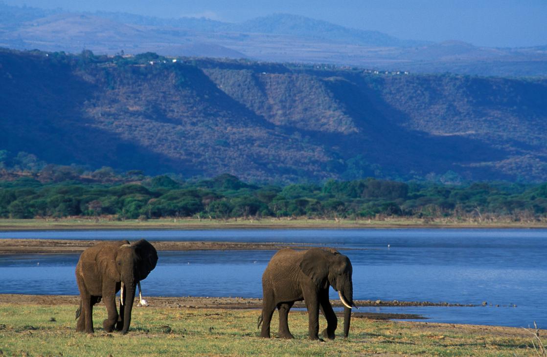 Elephants in front of the Manyara Escarpment of the Gregory Rift,in Lake Manyara National Park (Day 7)