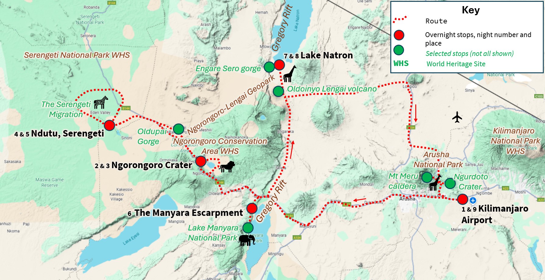 Day 2: Arusha National Park, the Great Rift Valley and Ngorongoro Crater. The day begins at Kitoto Viewpoint in Arusha National Park, an extraordinary window onto the volcanic structures of Mount Meru and its nested caldera system. As we drive westward, we stop at the Lake Manyara escarpment — the towering western wall of the East African Rift Valley, where a dramatic normal fault scarp marks one of Earth’s most active continental rift zones. We then ascend onto the high volcanic plateau of Ngorongoro, entering the Ngorongoro Conservation Area: a UNESCO Global Geopark and World Heritage Site, celebrated for its blend of Quaternary volcanism, tectonics, and unparalleled megafauna. Night: Ngorongoro Serena Safari Lodge (or similar).
