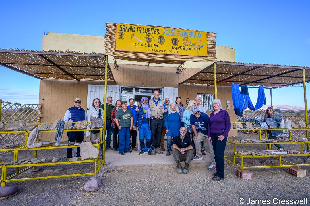 The GeoWorld Travel Morocco 2025 group at Brahim Ben Moula’s trilobite shop near Alnif.