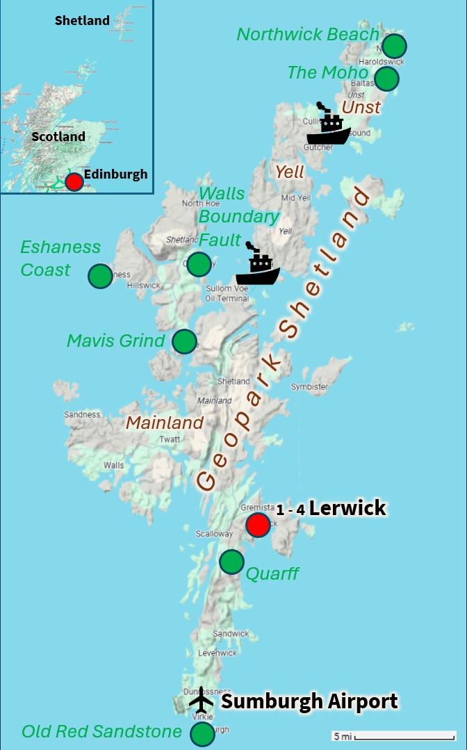 Day 3: North Mainland. Today is an opportunity to get to know the North Mainland. With dramatic rugged hills, sea cliffs and stacks, this is a landscape to remember. We will begin by taking a scenic route north to Mavis Grind – a narrow strip of land with North Sea on one side and the Atlantic Ocean on the other. Between the two, a geowall provides an insight into the complex geology we will witness throughout the day, beginning with extraordinary granite and diorite mixing at the Mavis Grind quarry. Breath-taking views may be enjoyed along the Eshaness coast as we walk through the flank of an ancient volcano and find vivid traces of its explosive past. The landscape remains dynamic today - as one of the highest energy coastlines in the world it is battered by the full force of the North Atlantic. In the afternoon we will enjoy the beach at Braewick - granite at the eastern end is faulted against Devonian sandstones and volcanics to the west. We will then follow the magnificent Ronas Voe beneath Ronas Hill, Shetland’s highest point at 450m formed as a granite pluton in the roots of the Caledonian mountains. At our finishing point of Ollaberry we will encounter the Walls Boundary Fault - the best exposure of the Great Glen Fault to be seen anywhere in Scotland. We finish the day back at our accommodation in Lerwick.